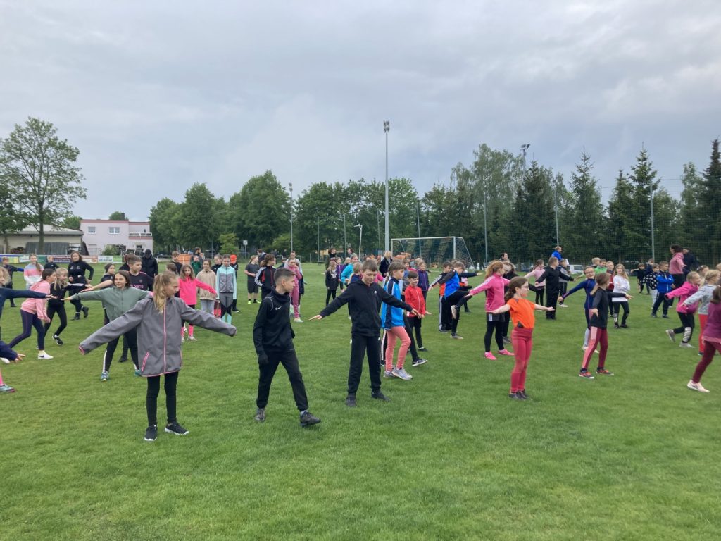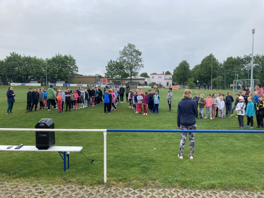 Auf dem Fußballplatz startete am 8. Mai mit poppiger Musik und einer von Frau Lange angeleiteten Erwärmung unser diesjähriges Sportfest. Die Schülerinnen und Schüler konnten beim Schlagballweitwurf, Sprint und schließlich Weitsprung ihre sportlichen Fähigkeiten miteinander messen. Die drei besten Mädchen und die drei besten Jungen wurden mit einer Medaille und Urkunde ausgezeichnet.