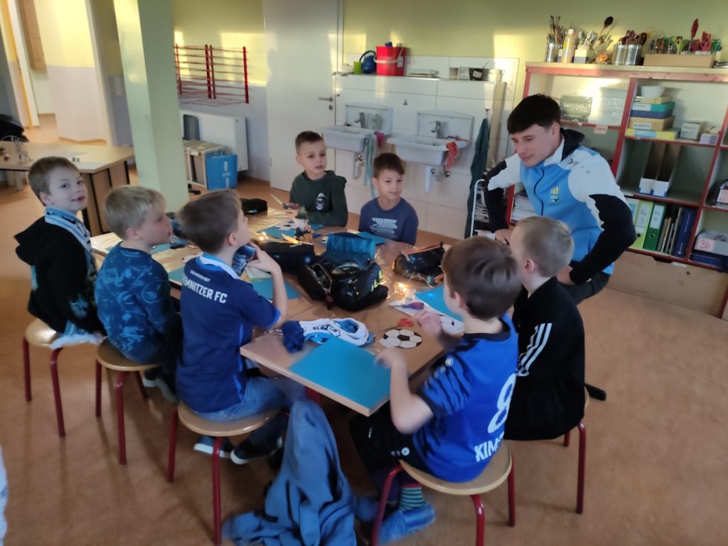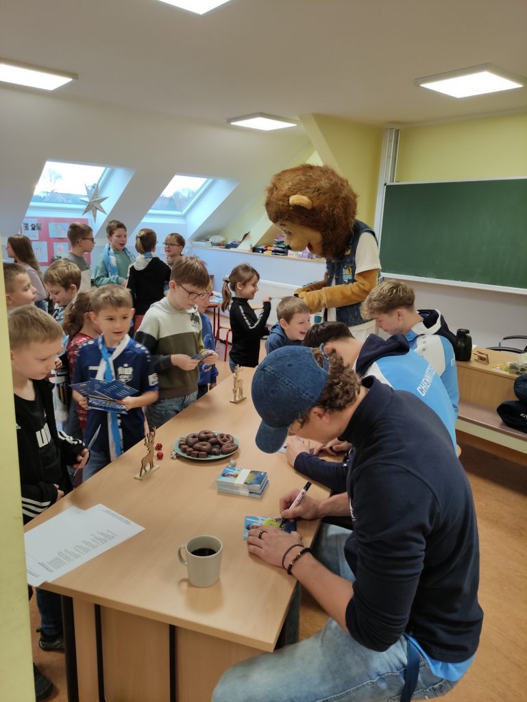 Ebenso dankbar blicken wir auf eine wunderbare weihnachtliche Stunde mit dem Chemnitzer FC zurück. Drei Spieler und das Maskottchen kamen zu uns, bastelten und sangen mit unseren Zweitklässlern, schrieben unzählige Autogramme und schenkten den Kindern unvergessliche Momente. Die Freude war riesig – vielen Dank für diesen besonderen Besuch!